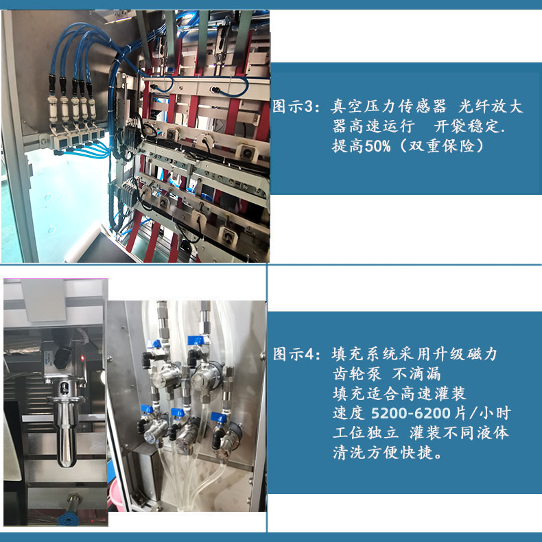 1、自動(dòng)下袋、自動(dòng)填充、自動(dòng)封口、打碼、成品輸出、自動(dòng)計(jì)數(shù),無(wú)袋不充填,無(wú)袋不封口;