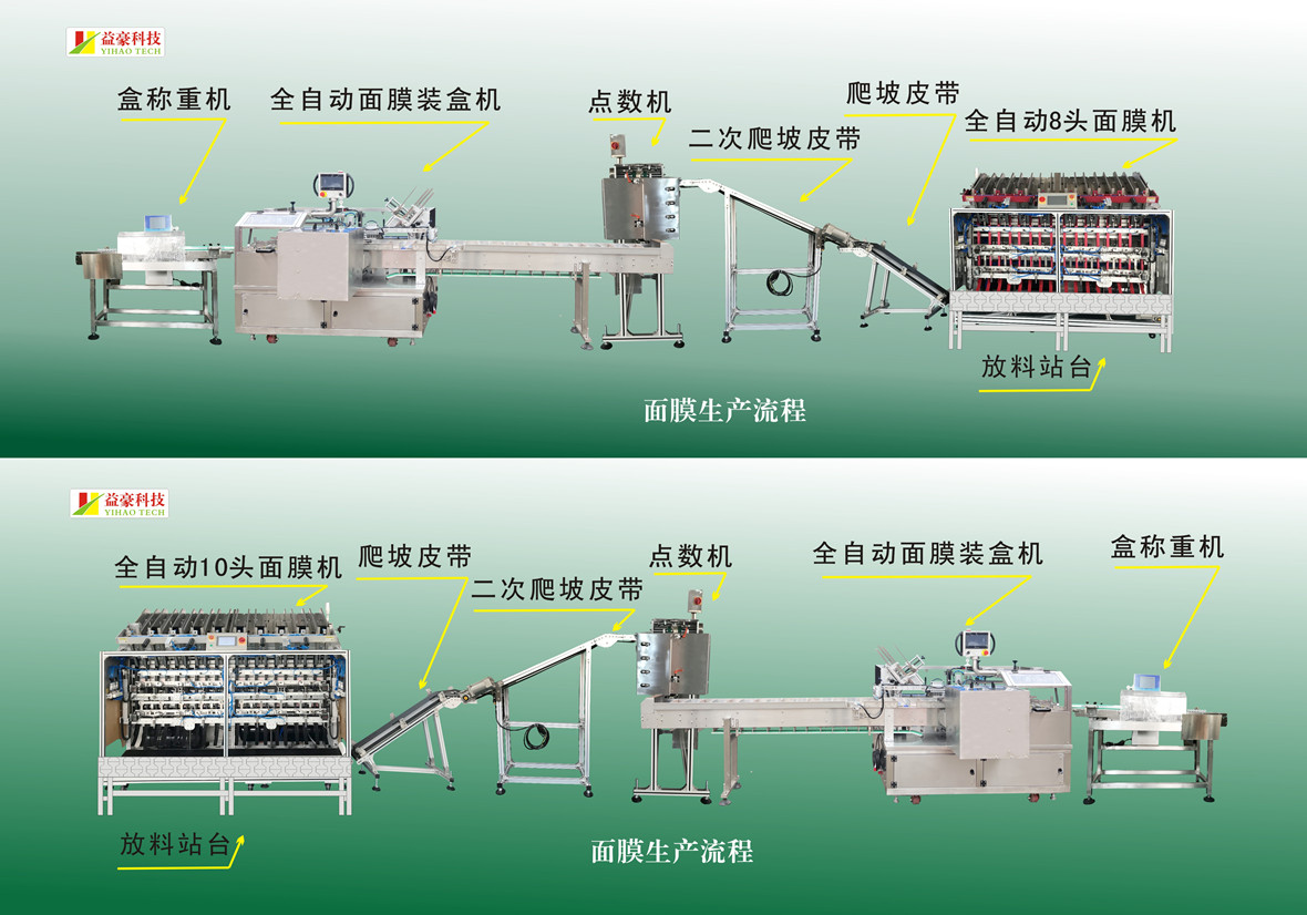 整線流程:面膜自動充填一封口一輸送一自動點數(shù)-自動裝盒-自動稱重一自動塑封一成品收集,二次爬坡皮帶:整齊的把灌裝好的面膜輸送到面膜點數(shù)機上。面膜點數(shù)機:對面膜進行點數(shù)堆疊,并自動放到裝盒機中。裝盒機:對上一工序點數(shù)好的面膜自動裝盒。